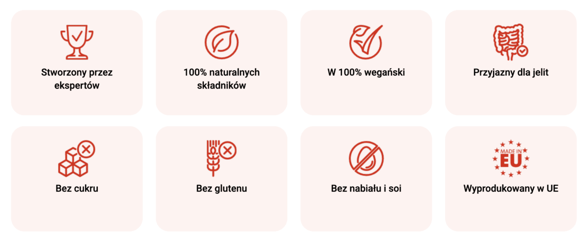 - Kontrola łaknienia. Skład produktu pomaga w ograniczeniu niekontrolowanych napadów głodu i ochoty na słodkie lub tłuste przekąski, co ułatwia utrzymanie zdrowej diety.